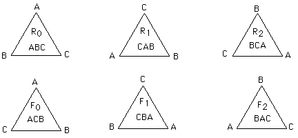 The three-letter codes ABC, CAB, etc., identify the orientations of the triangle; note that these codes always start with the top vertex, then the left one, then the right one.