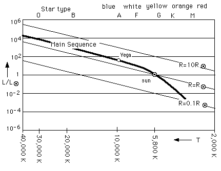 Because the wealth of information gleaned from H-R diagrams is enormous I will here mention only one interesting finding. The Main Sequence curve practically overlays the curve representing all stars with one solar diameter. Most stars have a diameter not less than one tenth (red dwarfs) nor more than ten solar diameters (red giants). Stars have a very limited range of size! And our star, the sun, is right in the middle of this range.