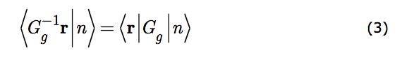 We now have two different prescriptions for the operator, G(θ) (Gg is the generic), that represents an alteration of an observer's perspective. It produces a transformed state, G(θ)|n, from the original |n. It generates a new descriptive space, r, from the old one, G-1(θ)r. That the two prescriptions be commensurate represents a philosophical commitment: that the altered appearance of a system (its transformed state) is due only to the altered scrutiny of the observer (the transformed coordinate system) and to nothing else. That is the content of Equation (3).